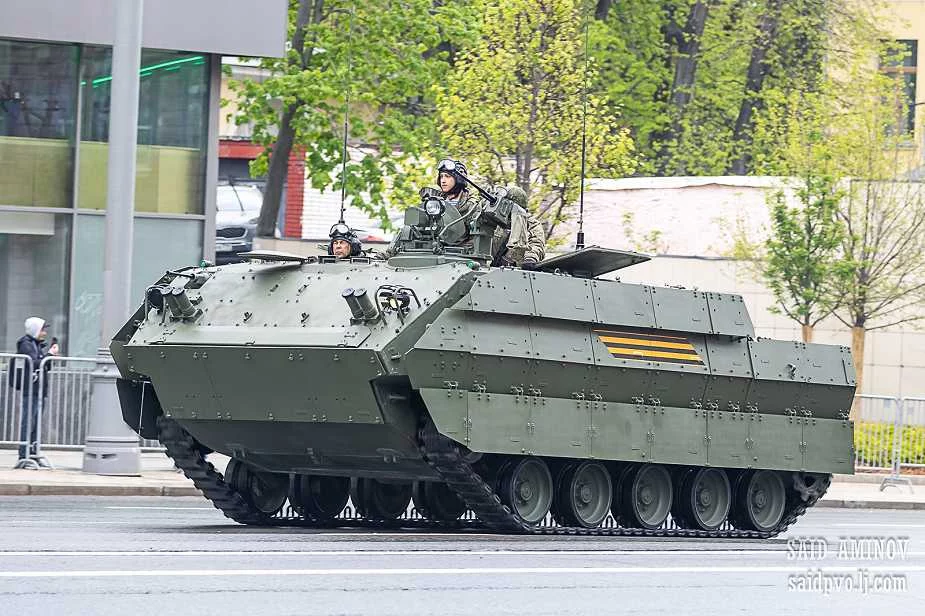 БМП-3 е верижна бойна машина на пехотата, известна със своята отлична огнева мощ и мобилност. В представения на парада вариант, машината е оборудвана с допълнителни бронирани плочи отпред и отстрани, както и с телена броня около кулата, които значително повишават защитата срещу противотанкови оръжия и импровизирани взривни устройства (IED).
